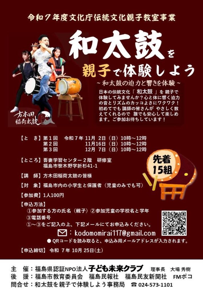 NPO法人子ども未来クラブの「和太鼓を親子で体験しよう」事業は各小学校を通じて募集致しましたが想像以上に申し込みが殺到し締め切らせて頂きました。