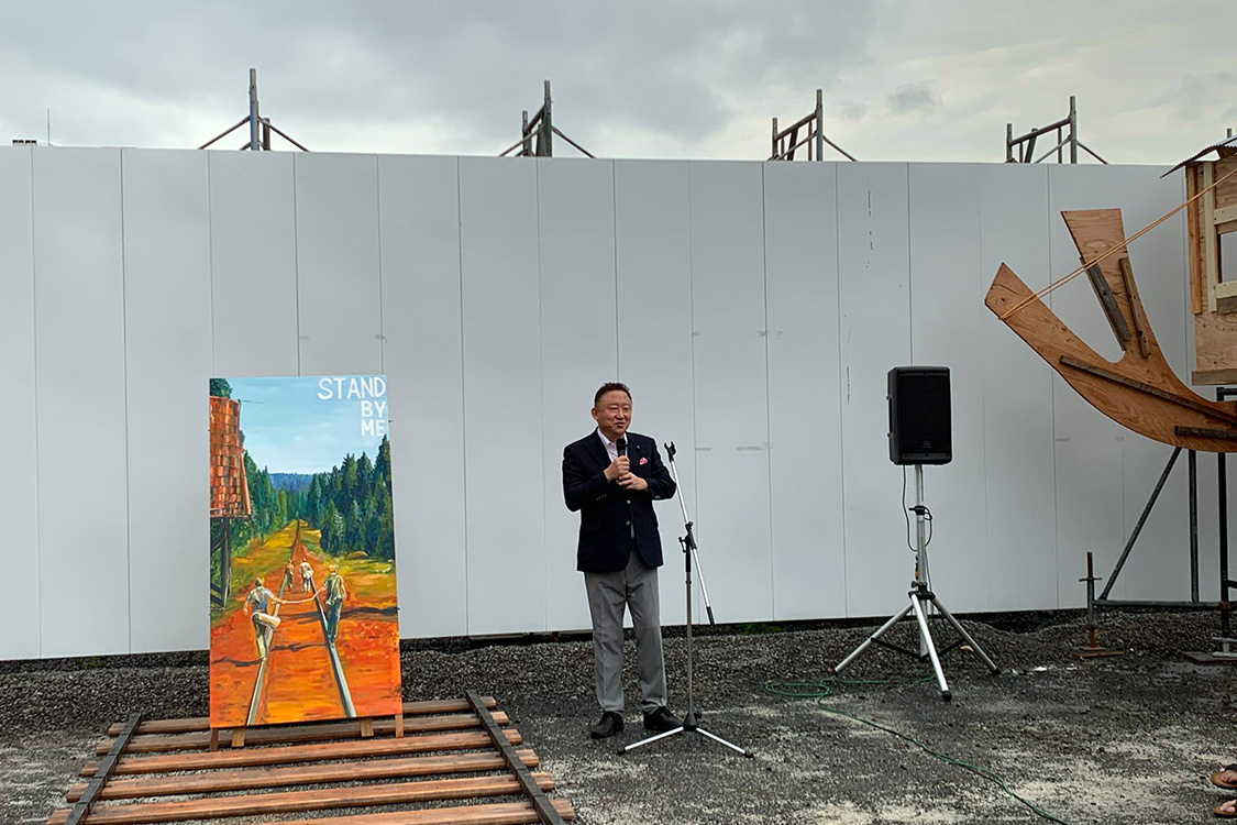 駅前再開発が進む福島市駅前通り、来年閉鎖予定の駅前にぎわい広場の工事用白フェンスに直接映画を投影。映画に出てくるメニューを再現しました。
