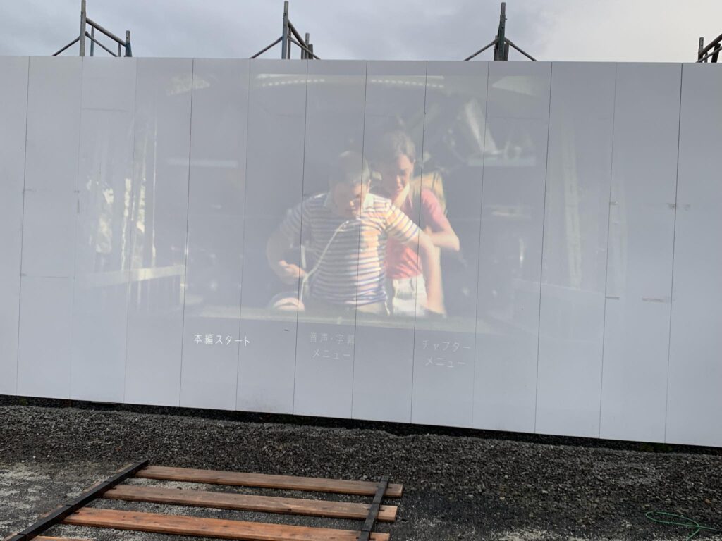 駅前再開発が進む福島市駅前通り、来年閉鎖予定の駅前にぎわい広場の工事用白フェンスに直接映画を投影。映画に出てくるメニューを再現しました。