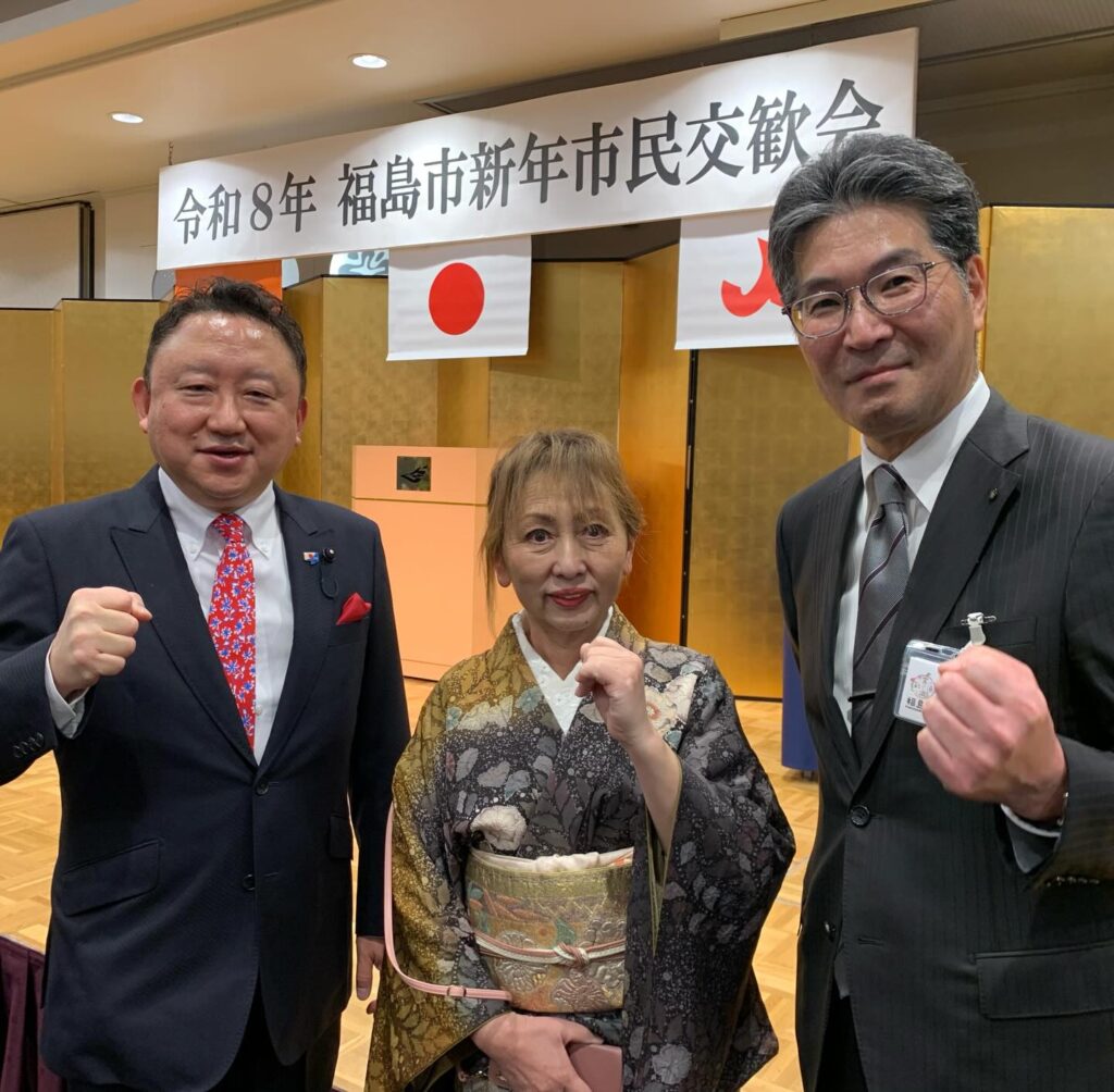 交歓会では福島市教育長の佐藤秀美先生と婦人団体連合会村島会長と。教育長さまにはNPO法人子ども未来クラブの抱負をお話しし、飯坂では他の来賓の方々と鏡割りを行いました。本当に多くの皆さまと新年のご挨拶を致しました。福島の皆様が幸せな年になりますことをお祈りし、私自身もしっかり仕事していく決意新たにした1日でした!