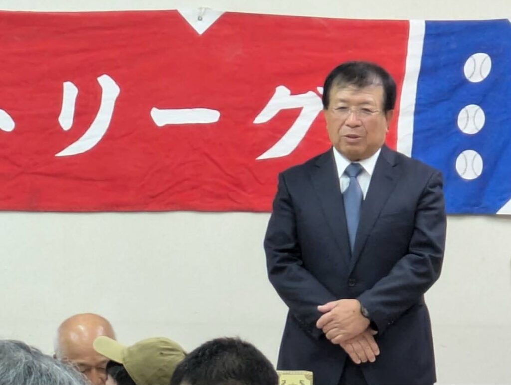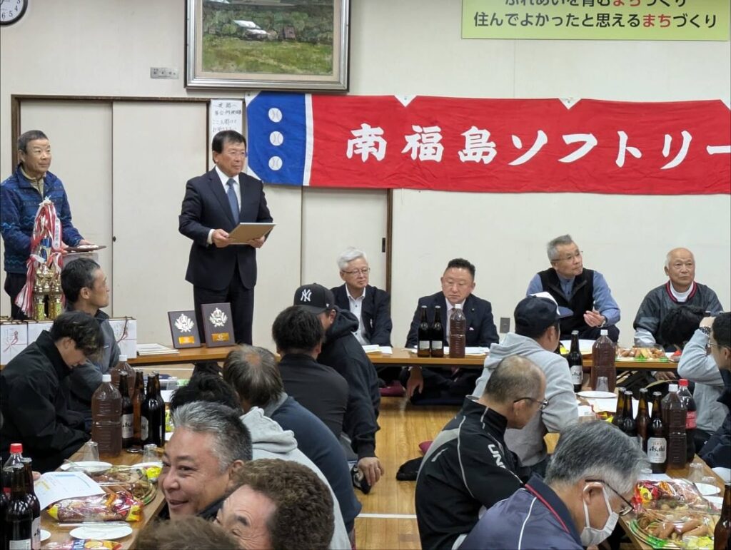 元福島県教育長の杉明重先生が会長を務めるソフトボールリーグの今期大会表彰式にお招きを頂きご挨拶いたしました。大場は「大会開催に尽力頂いている杉会長はじめ大会役員の皆様に敬意を表します、来期は優勝した杉妻親交会やオール方木田打倒!で怪我なく頑張ってください、私はNPO活動を通じて福島からソフトボールの灯を消さないよう小学生大会をやっていきます」